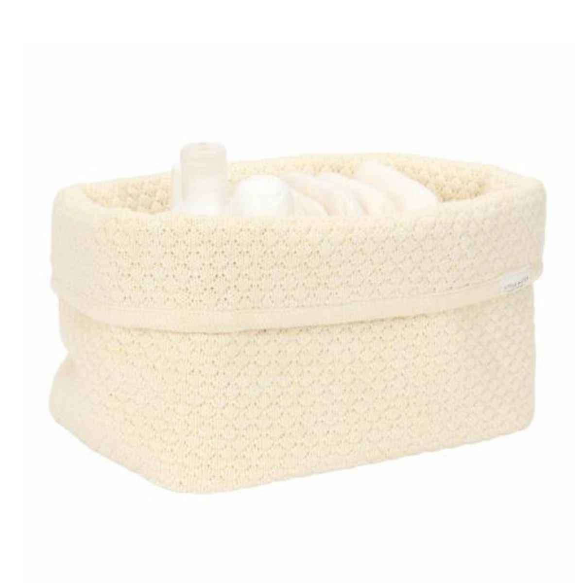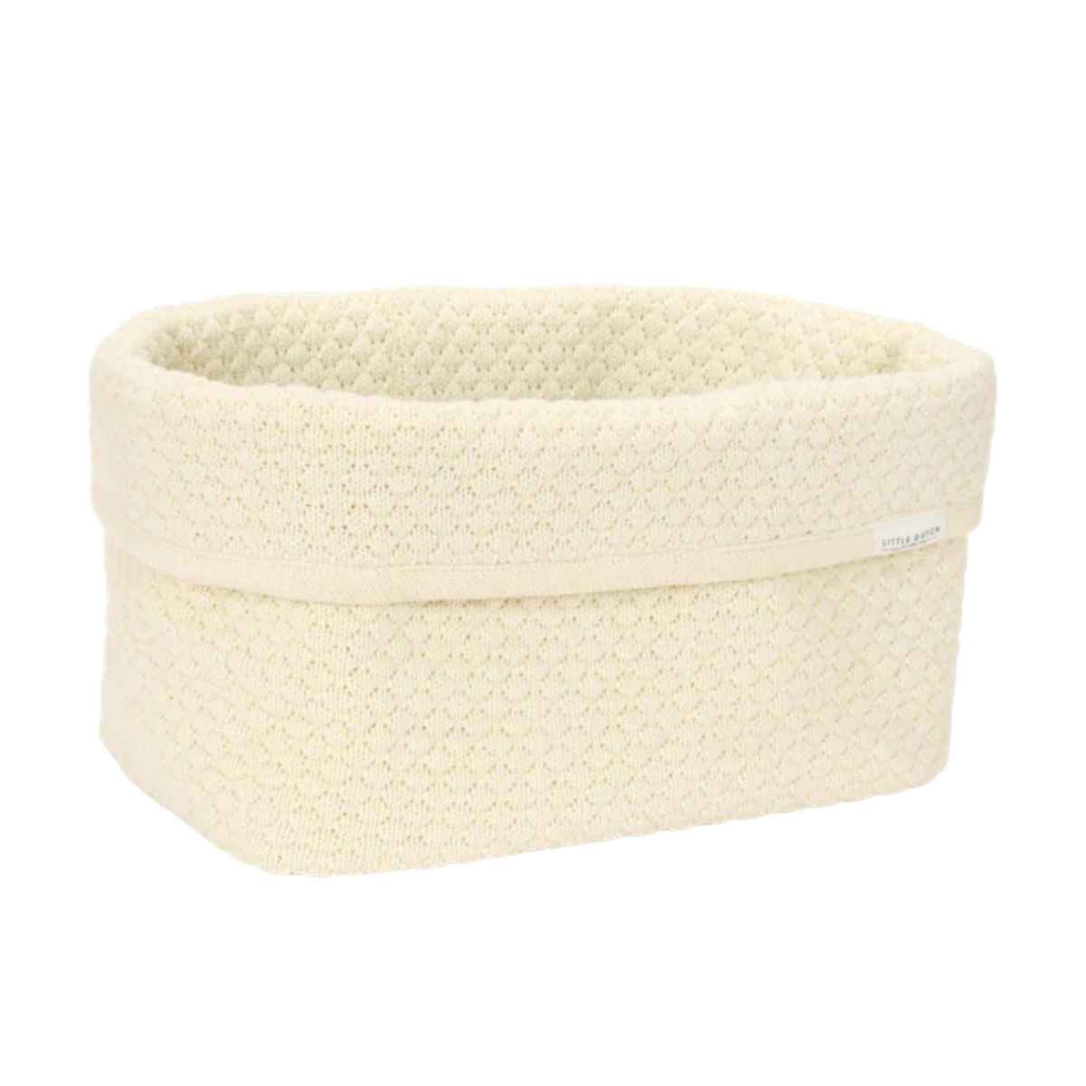 With this storage basket, the changing table stays neat and organized. Made from knitted 100% organic cotton with reinforced sides, it offers ample space for all your daily essentials for taking care of your little one, such as diapers, tubes, and bottles. The fold-over edge allows you to use the basket at two heights. The stitched pattern combined with the timeless color Pure Soft White gives every room a bright and serene appearance. Available in two sizes.