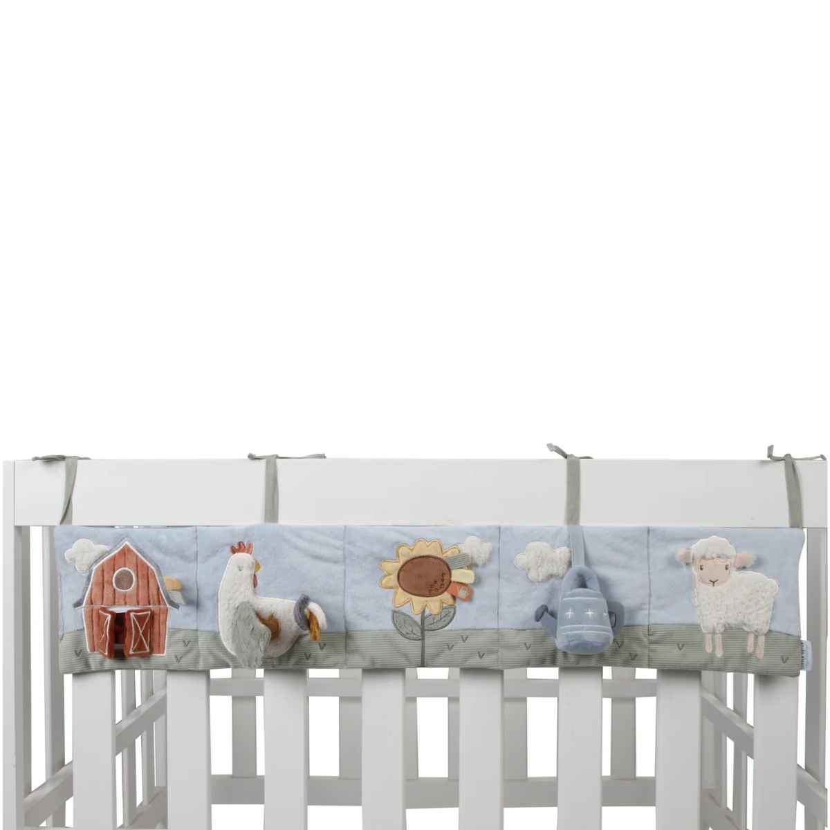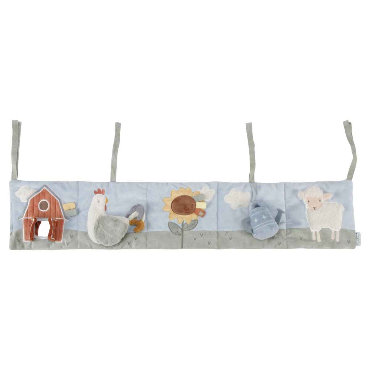 Come play in the playpen! Let your little one explore with the Little Farm activity hanger. Feel the different labels on the barn and take a good look at yourself in the mirror. Do you hear a crinkle in the wings of the chicken? Give the watering can a push and you'll hear the rattle automatically! This fun activity hanger stimulates your baby's hand-eye coordination. Simply attach the hanger to the playpen or crib in the right position using the cotton strings. Interesting for your baby to look at in the first few weeks, but even more fun to play with from tummy time.