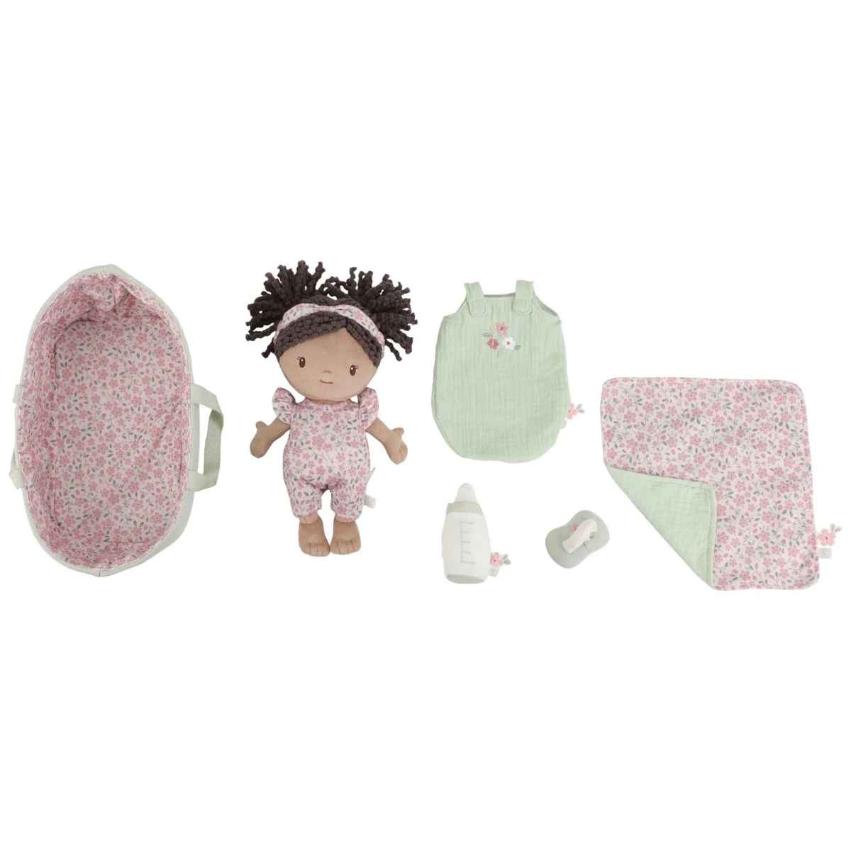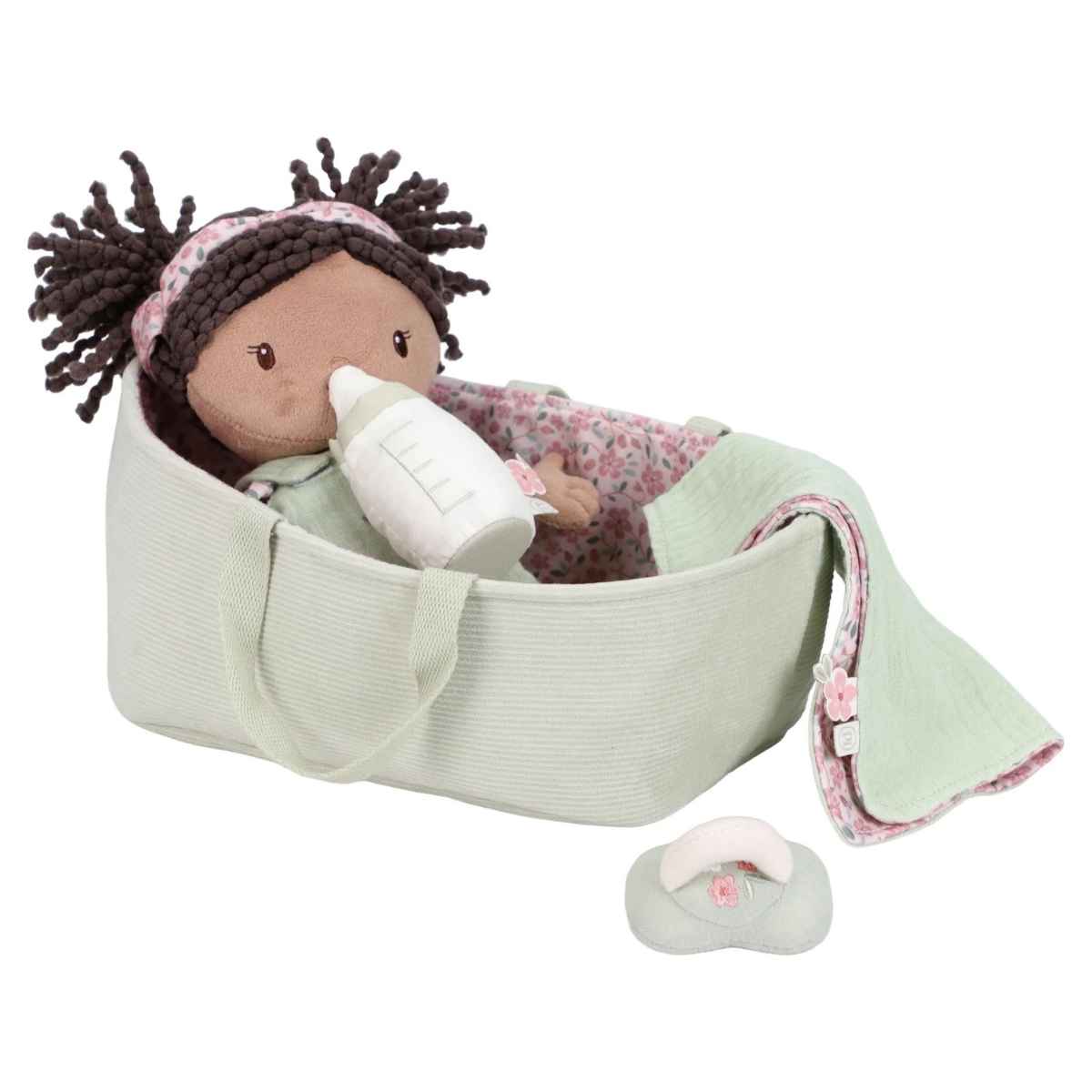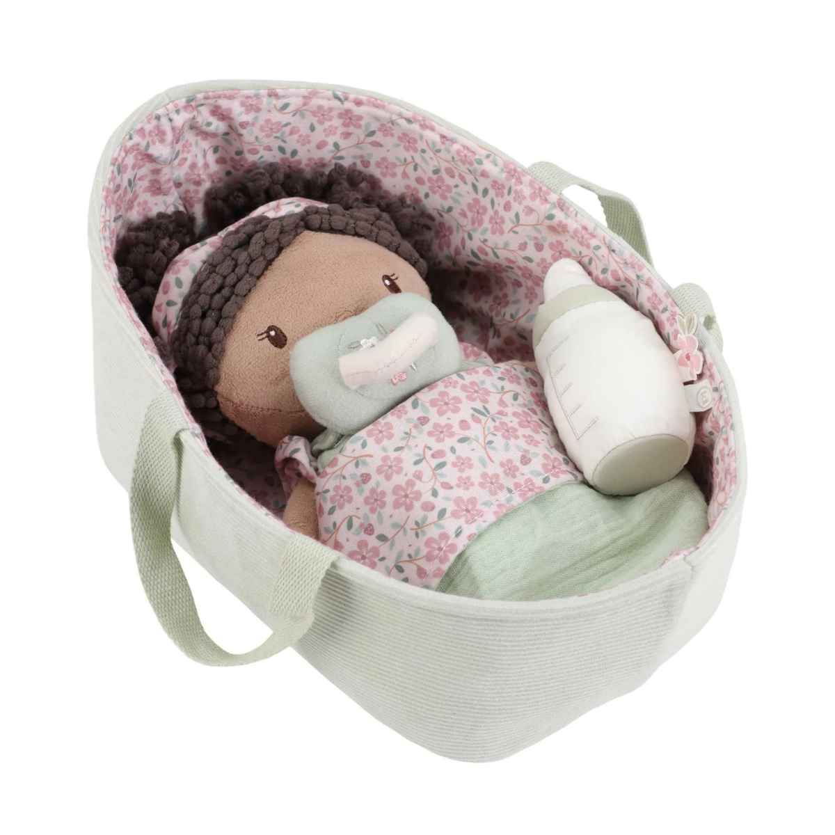 Meet baby doll Evi in her soft travel basket. Evi is wearing a cute sleeping bag, romper, and diaper that you can put on and take off. With her pacifier and bottle, which stay attached to her mouth thanks to a magnet, caring for her is extra fun. The ribbed fabric basket with floral print and the matching blanket complete the set. Perfect for hours of cuddling and role play.