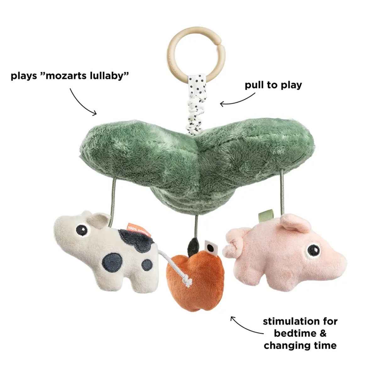 Soothe your little one with the gentle melodies of this charming musical mobile. Pull the clover to play the calming tune of Mozart’s Lullaby, while Dotti, Pigee, and the apple move gracefully to capture your baby’s attention.