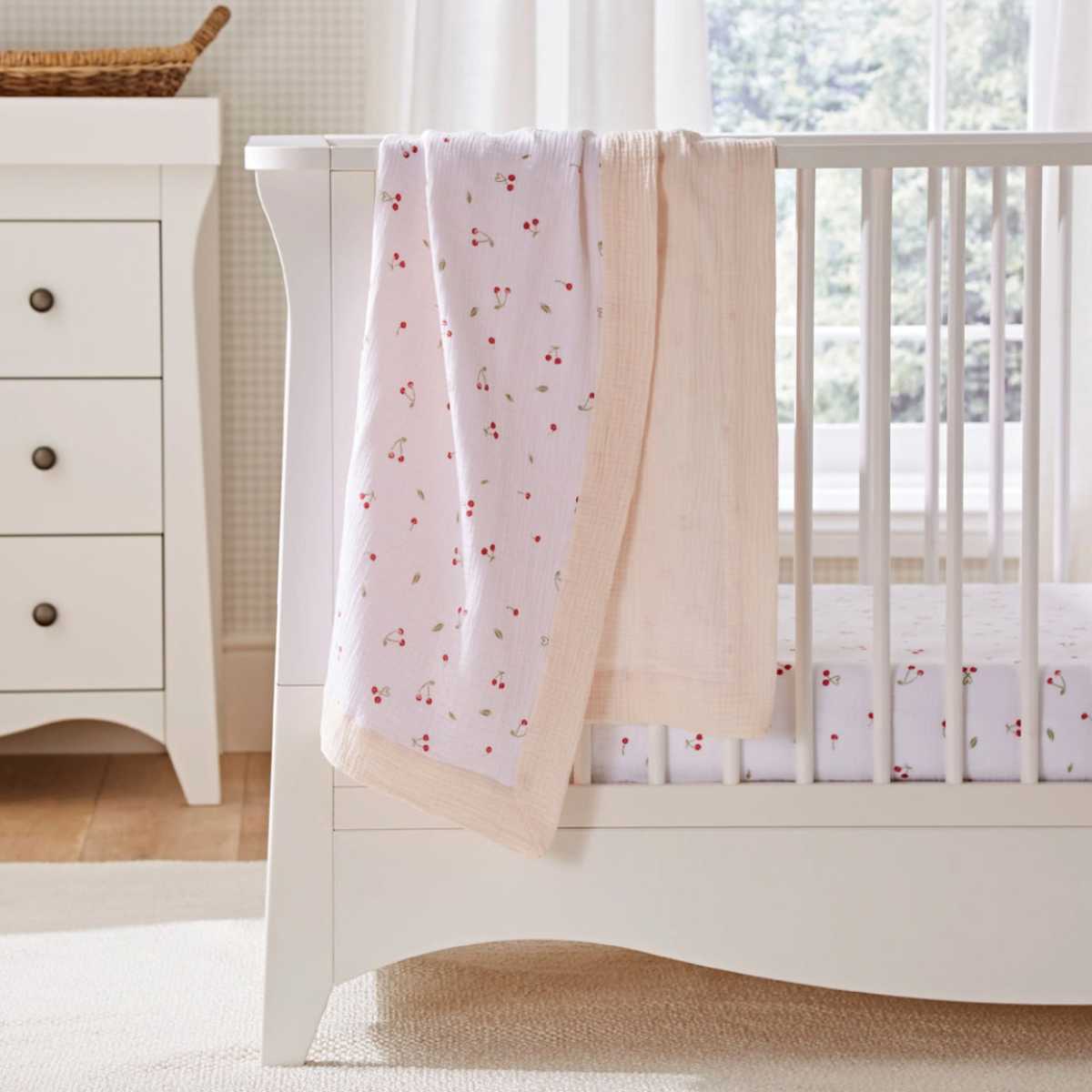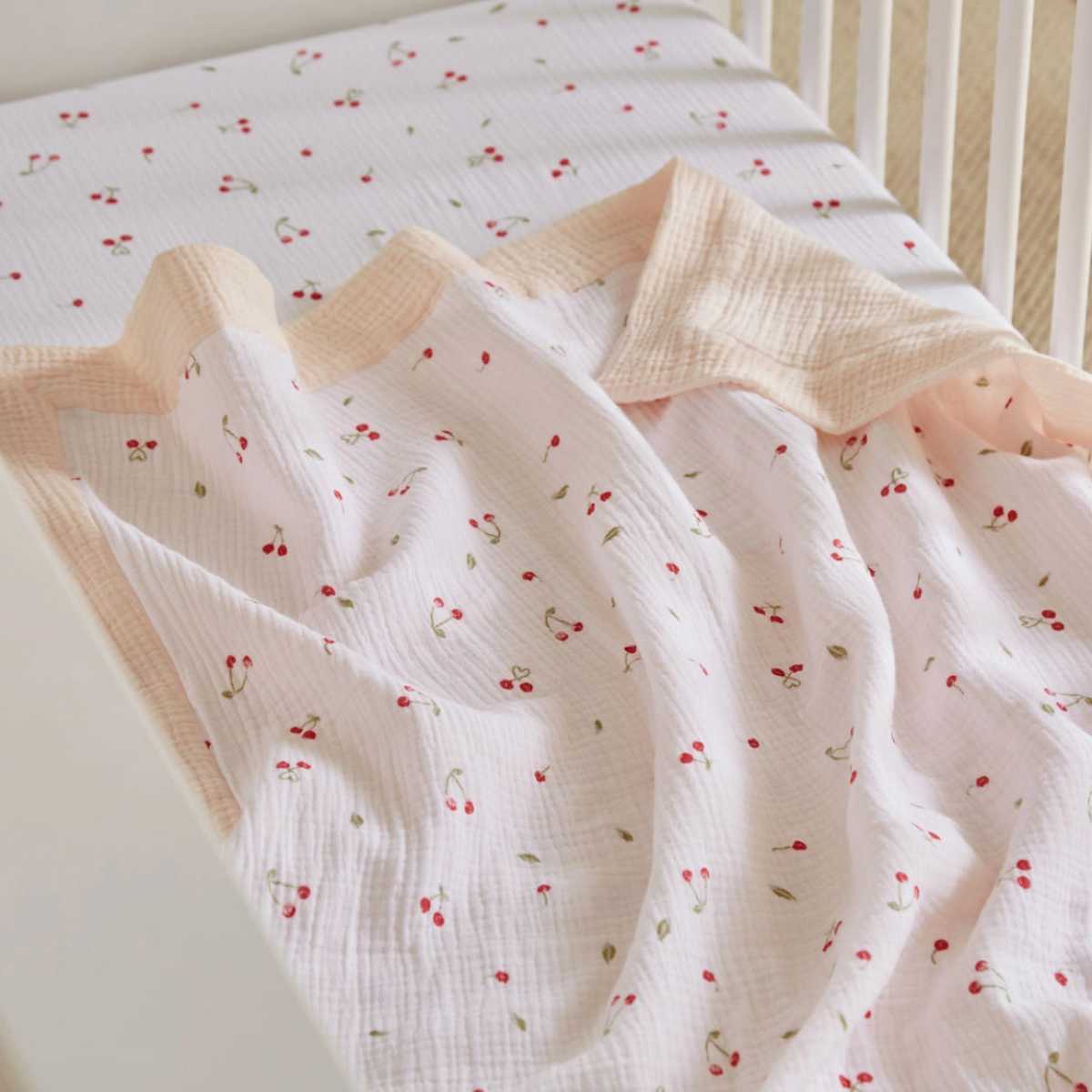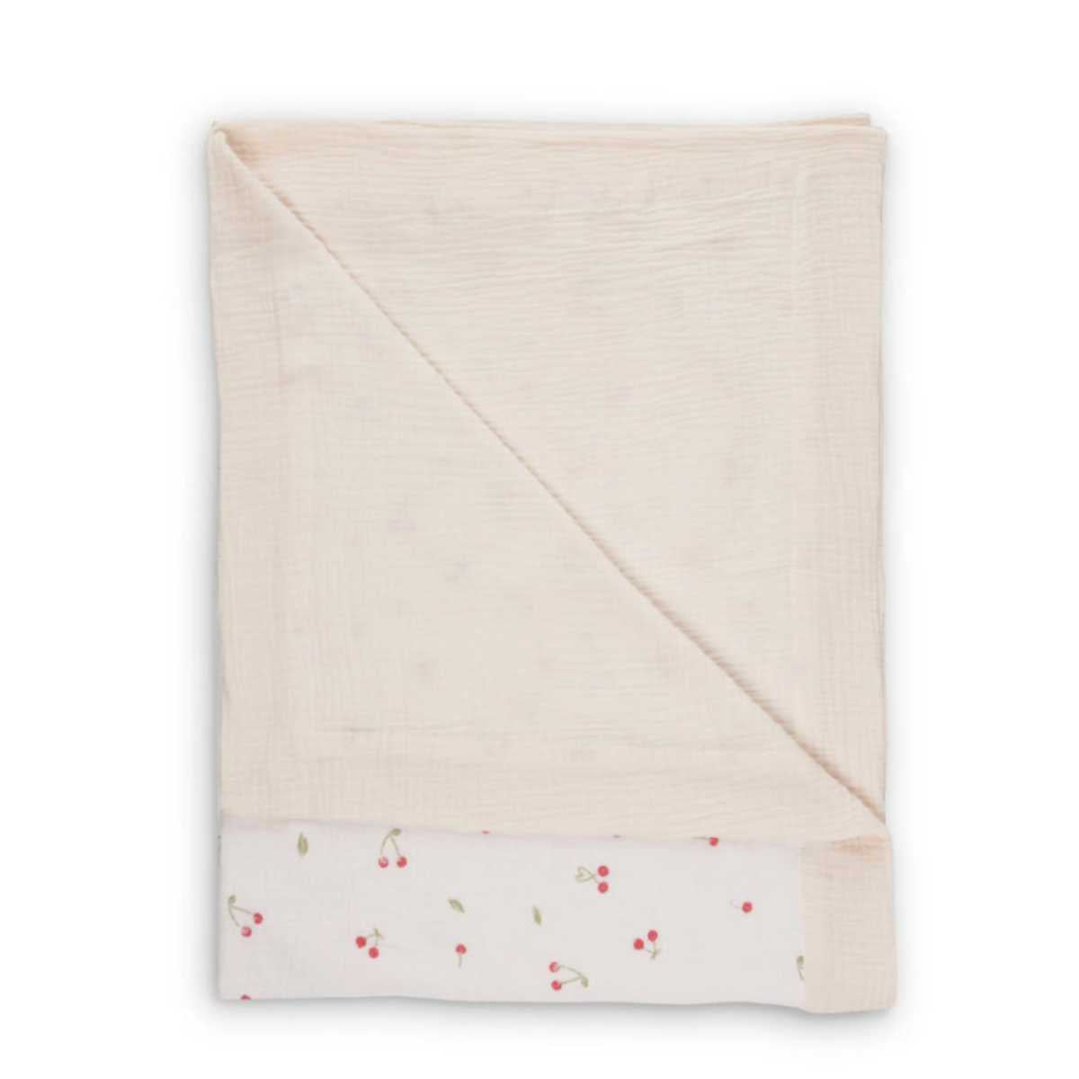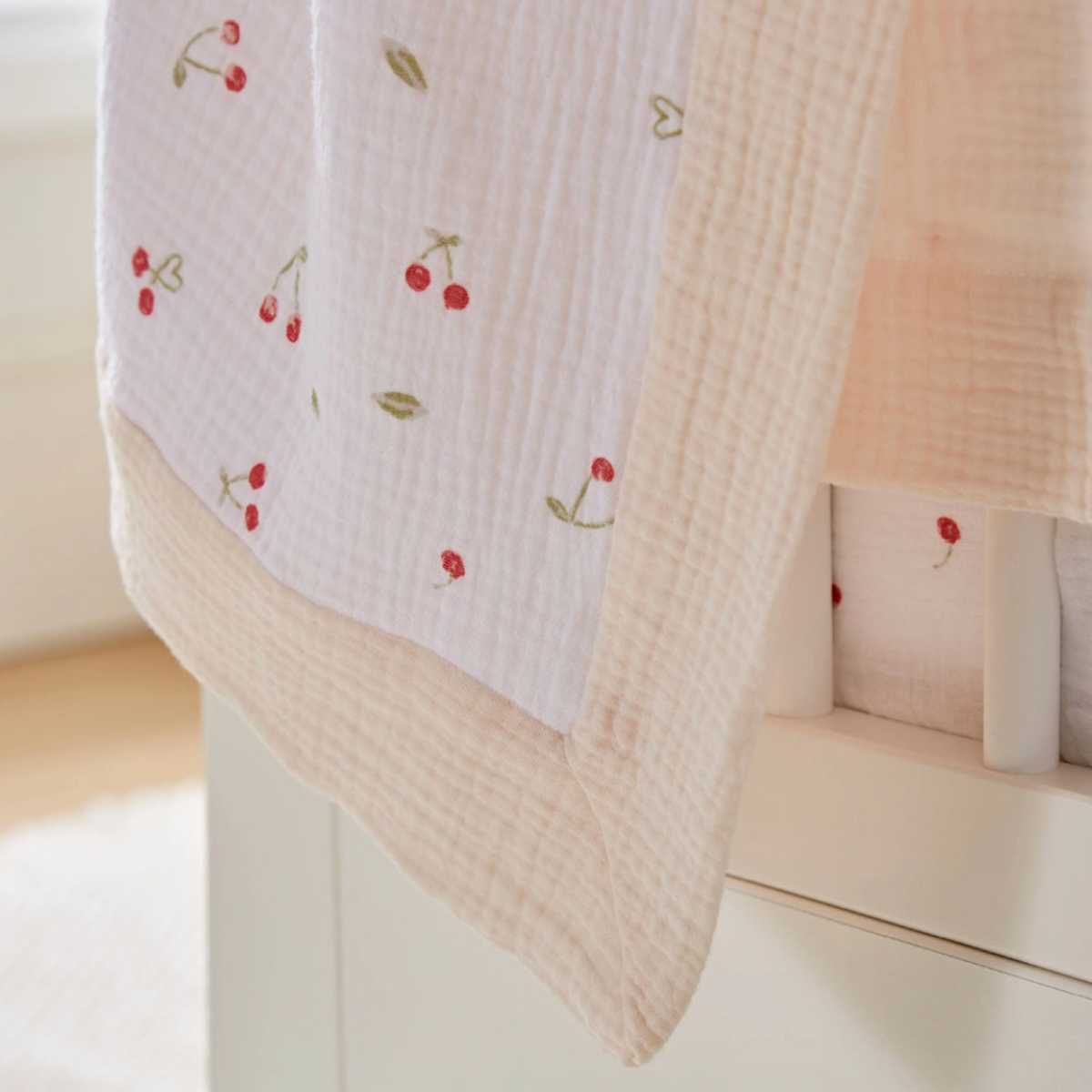 Wrap your little one in comfort with this beautifully soft Ditsy Cherry Comforter Blanket. Crafted from four layers of cotton muslin, it offers extra warmth and cosiness while still feeling light and airy perfect for year round use. The textured finish and cherry print add a small touch, making this blanket stylish and practical. Easy to fold and pack, it’s ideal for when you’re on the go. Suitable from birth, this comforter blanket is designed to keep your baby snug without overheating.