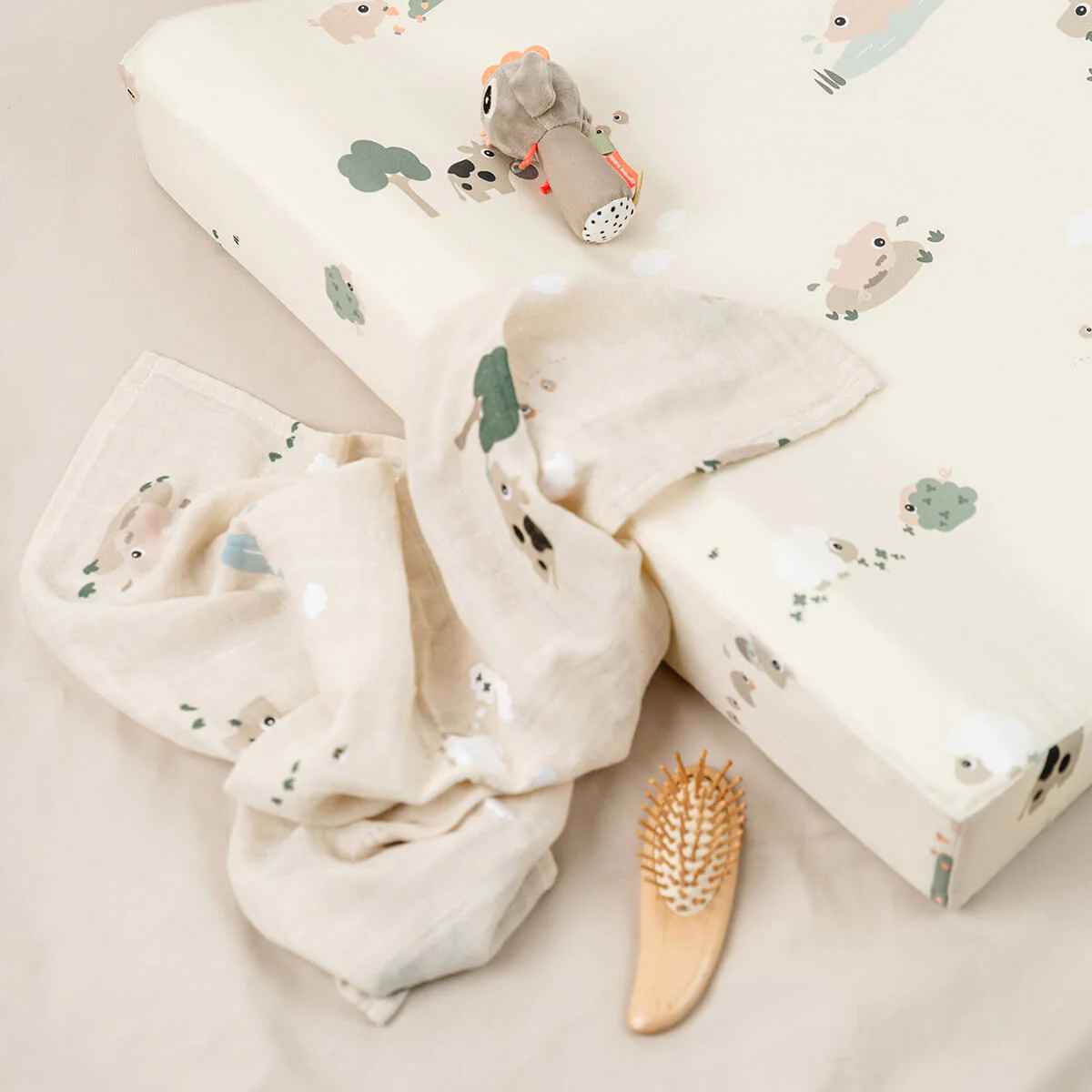 With a water-resistant surface that can be wiped clean, it’s as practical as it is charming. The soft sand colour and cute motif with Dotti, Pigee, and Sheepy add a playful touch, making changing time feel a little more special.