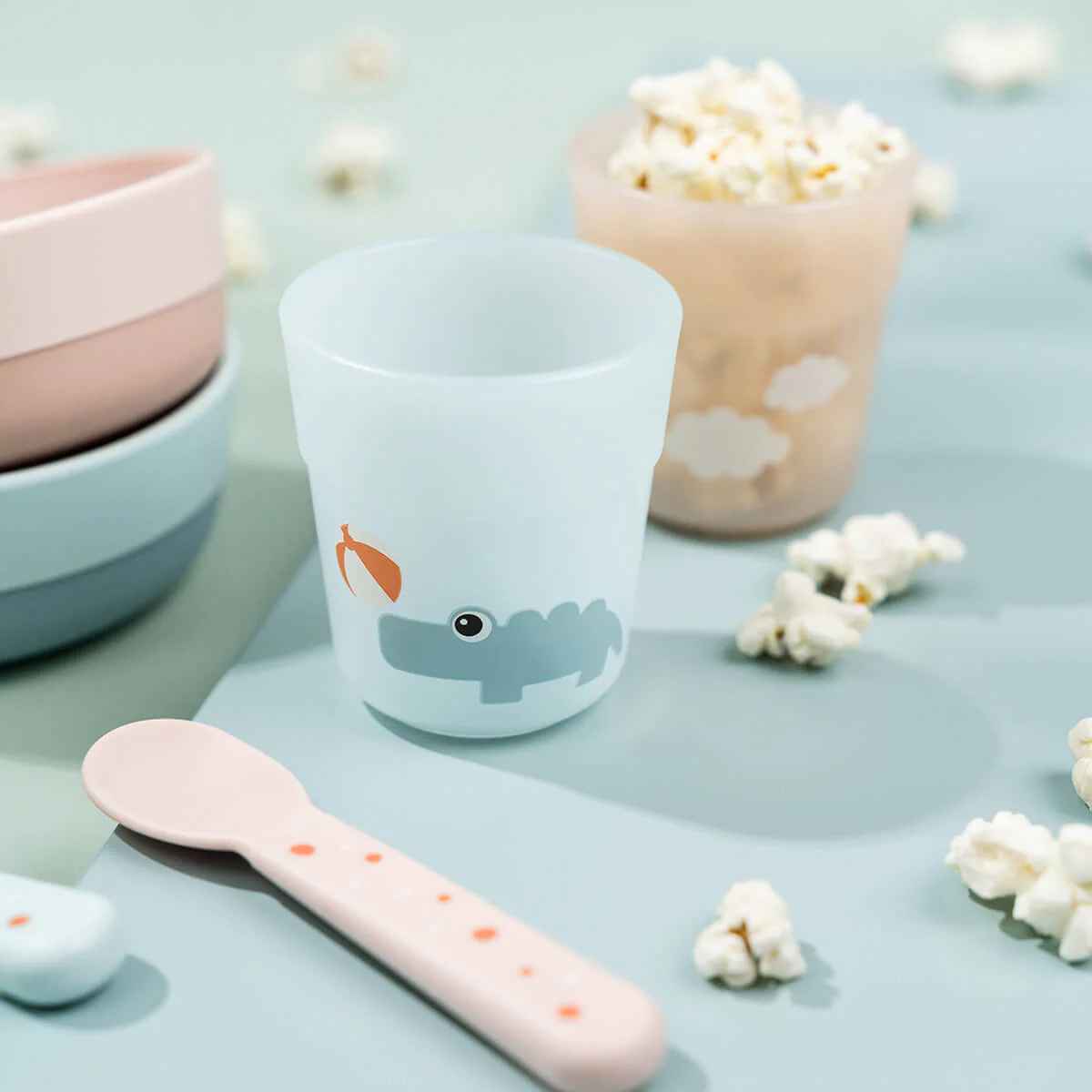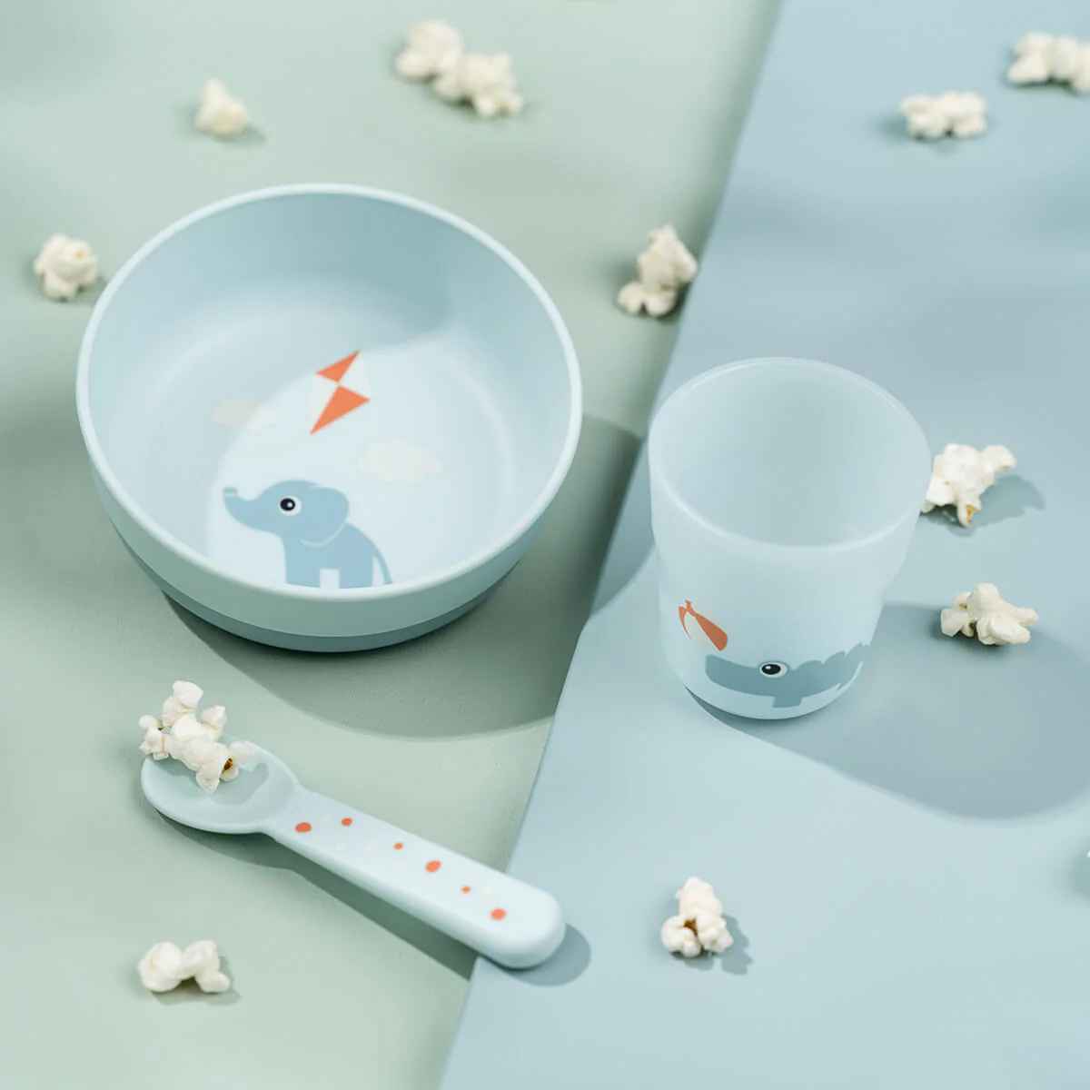 This blue Foodie first meal set is perfect for introducing your little one to its first mealtime adventures. The set includes a bowl, a semi-transparent mini mug, and a feeding spoon, all in lovely blue hues. The bowl has an anti-slip base for stability during meals, while Elphee and Croco add a playful touch.