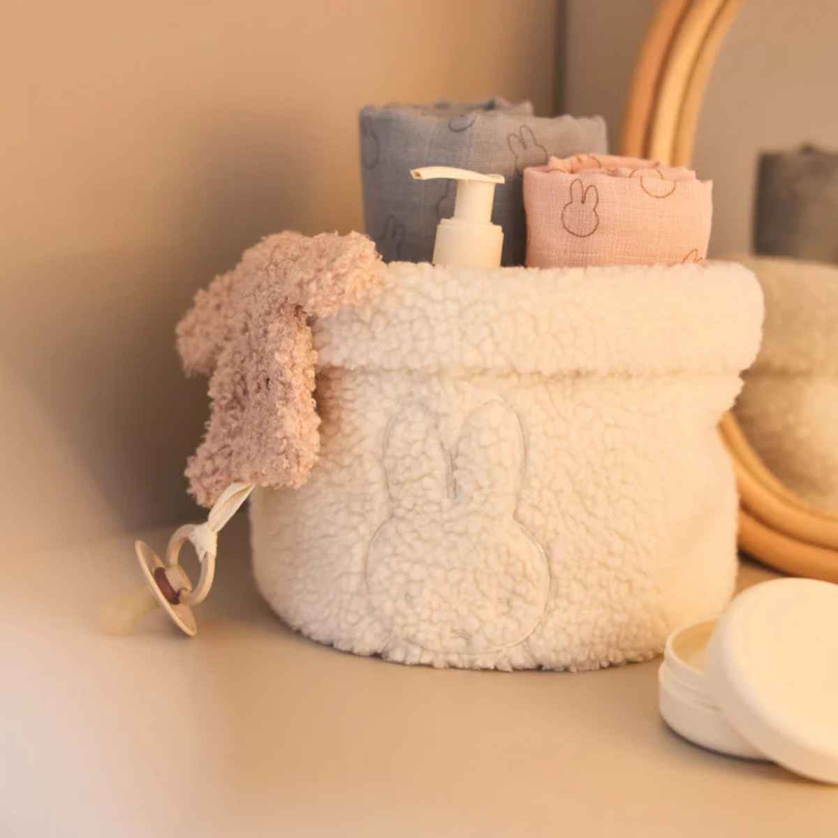 Storage has never been easier with this beautiful storage basket. Wonderfully stylish and you can put more into it than you think. The basket is made of wonderfully soft teddy fabric in the shade oatmeal, with a cute embroidered Miffy on it. Enjoy a stylish baby room.