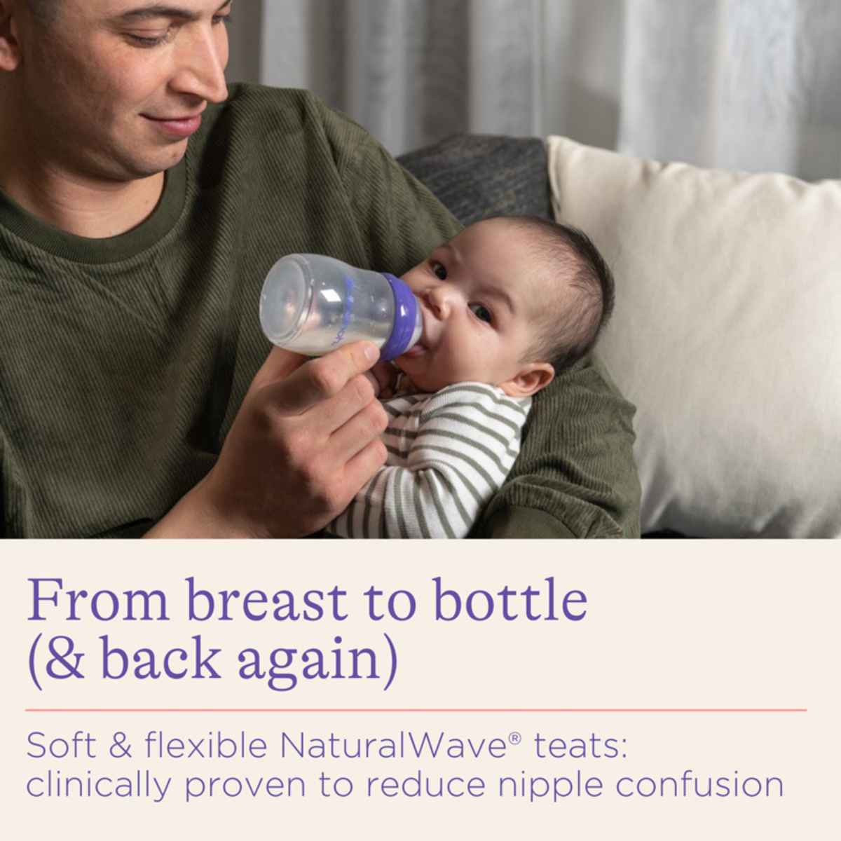 Featuring the innovative NaturalWave® Teat - clinically proven to reduce nipple confusion with extra-soft and flexible silicone which adapts to baby’s palette, encouraging natural tongue movement and allowing baby to control the milk flow.