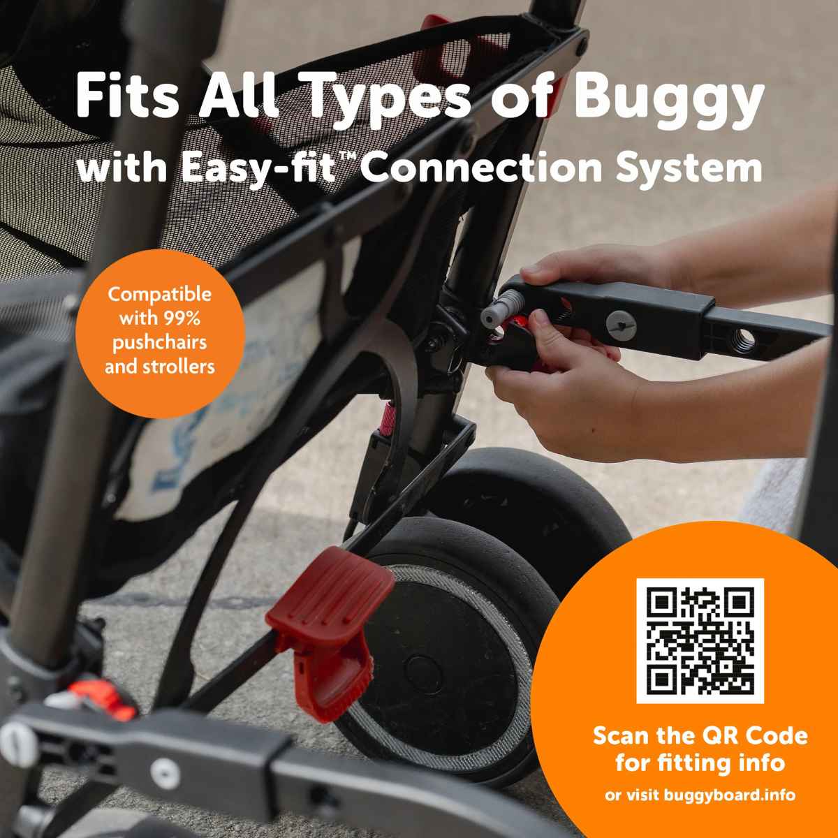 - Its patented easy-fit connection system securely fits 99% of pushchairs.