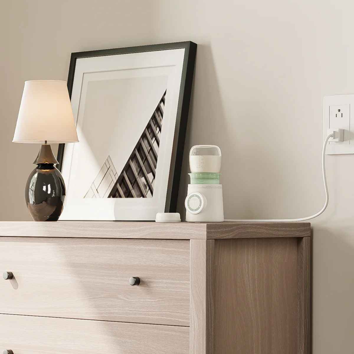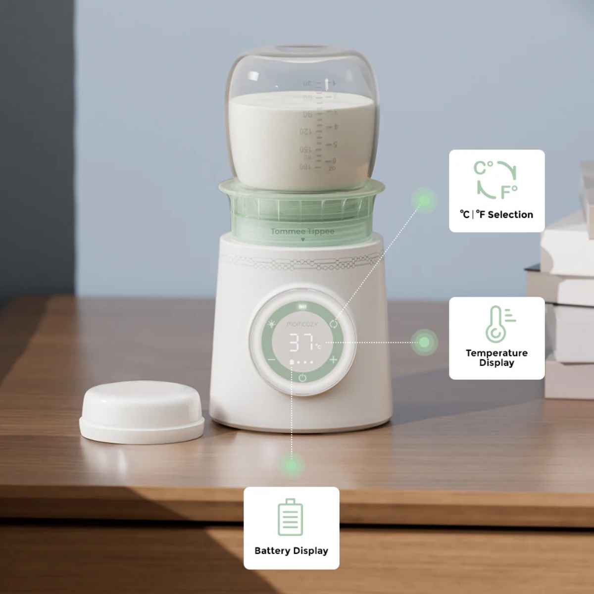 It can heat 120ml of milk to 37C in just 2 minutes and offers adjustable temperatures between (32°C - 50°C). A full charge heats 6-14 bottles of 120ml or 4-9 bottles of 180ml. Compatible with most bottle brands, it includes five adapters for popular sizes, just insert the bottle or use the connector, press power, and warm milk is ready in minutes.