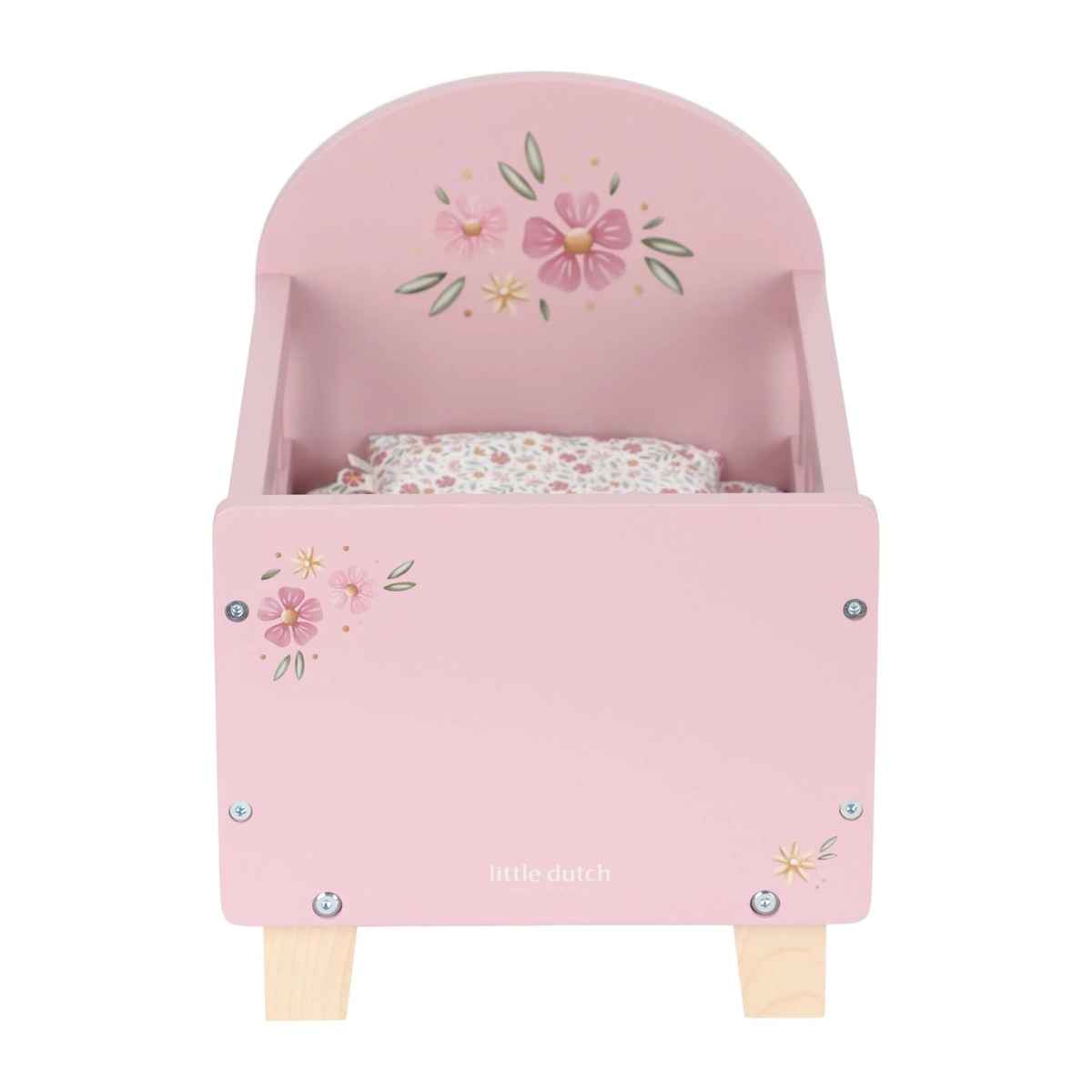 In this wooden doll bed, your doll sleeps wonderfully soft and comfortable. The bed comes with a cozy pillow, a warm blanket, and a soft mattress, all in the enchanting Soft Flowers design. The elegant wood-colored legs and the beautiful flower illustration give the bed a romantic look. Perfect to give your doll a nice place to rest after a long day of playing. A beautiful addition to the doll room!