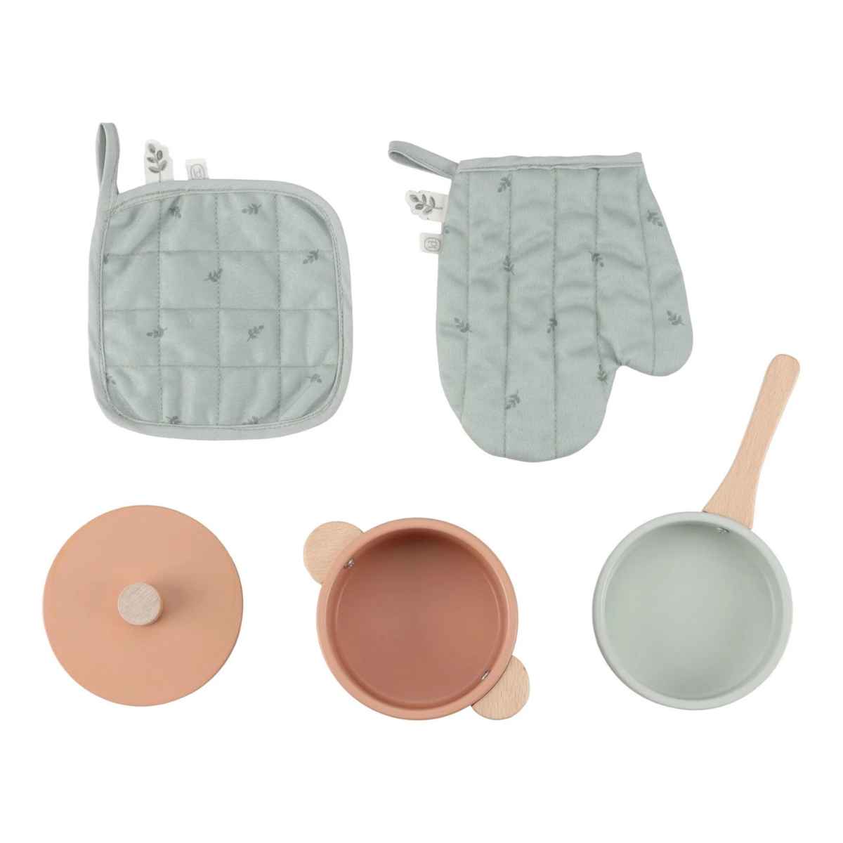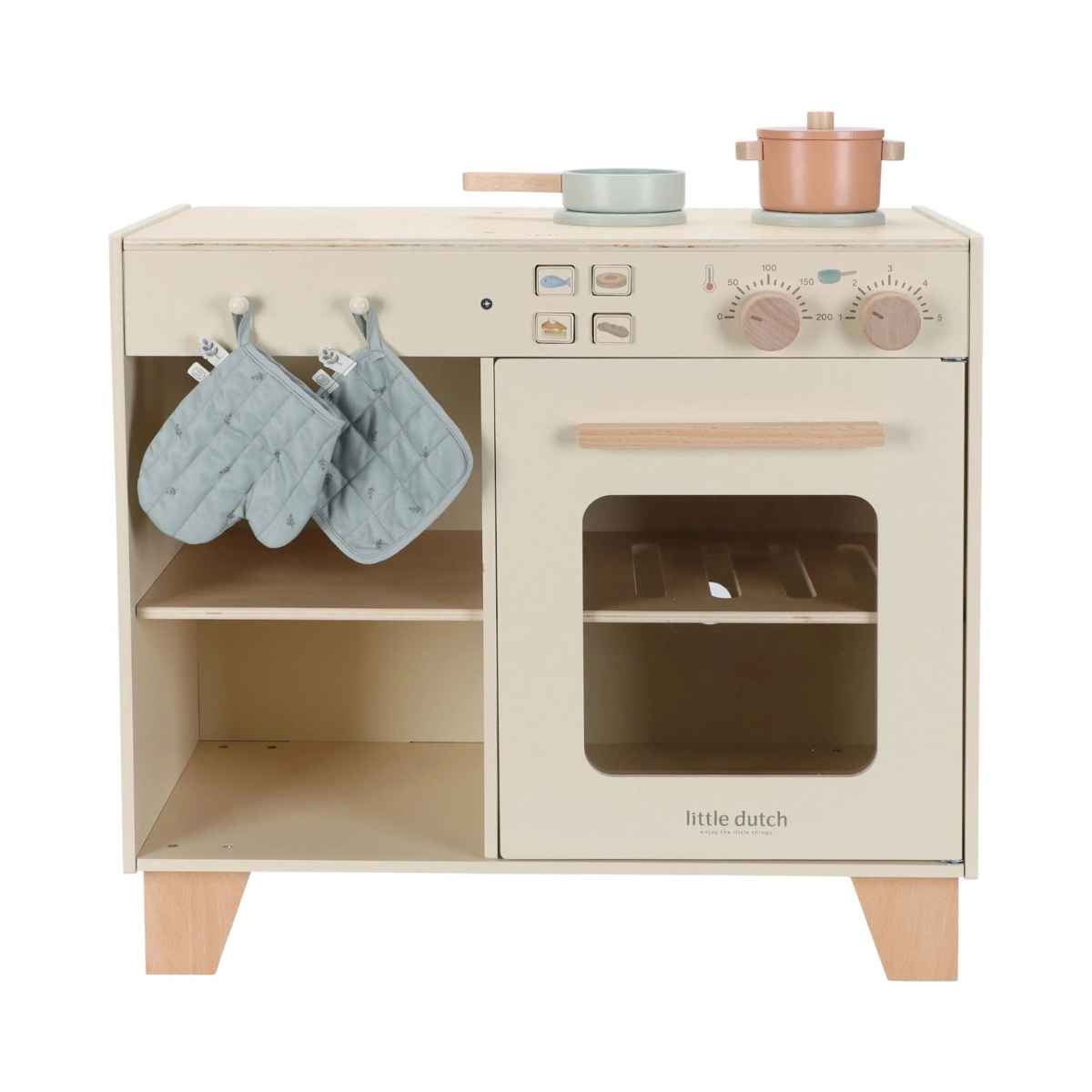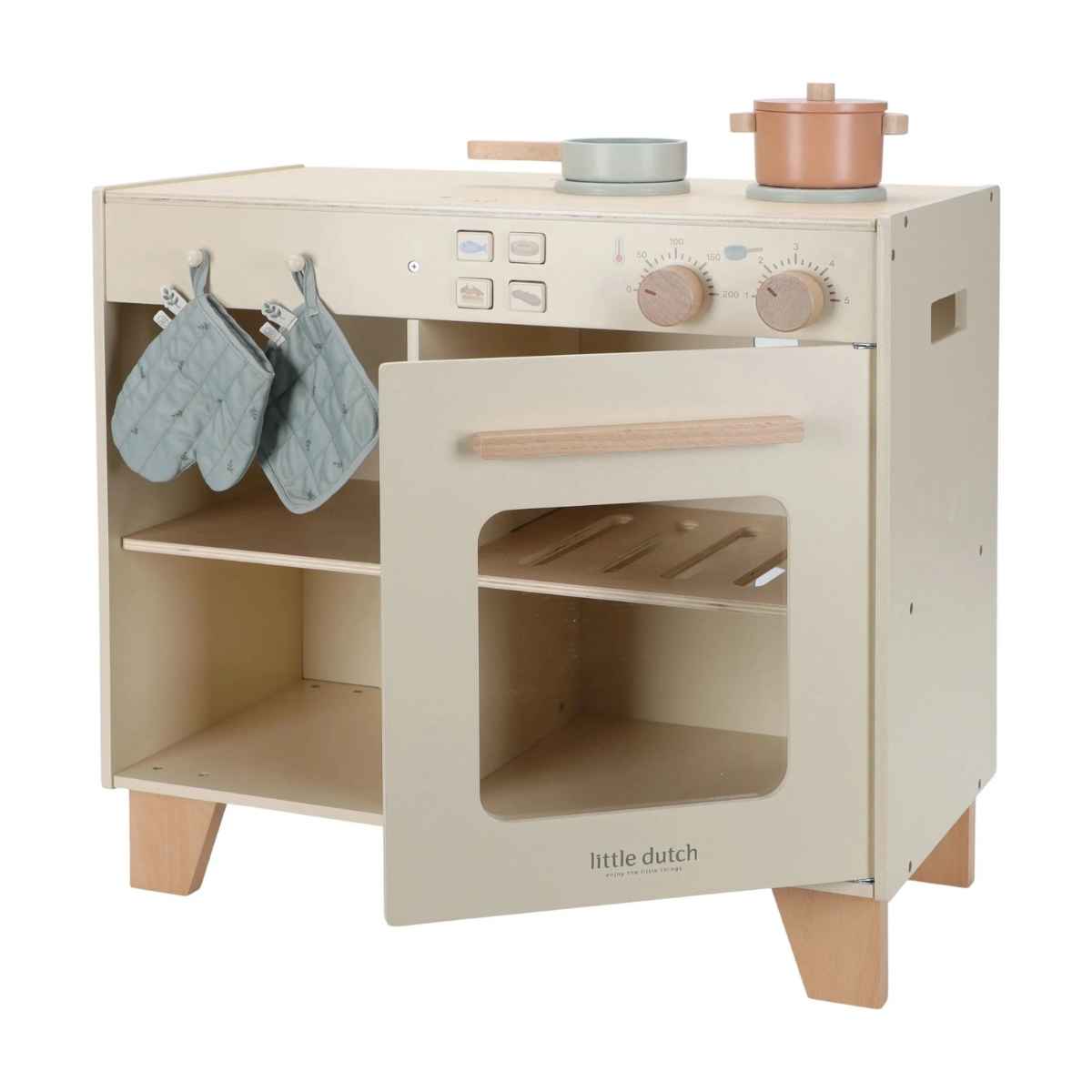 Little chefs, pay attention! This beautiful wooden cooking station is perfect for preparing the most delicious dishes. Bake a cake in the oven or cook fresh vegetables on the stove. The set includes two pans, a potholder, and an oven wall, and is equipped with push buttons with illustrations for extra realism. Combine the cooking station with the refrigerator or washing machine and dishwasher set to create a complete play kitchen. What's on the menu today?
