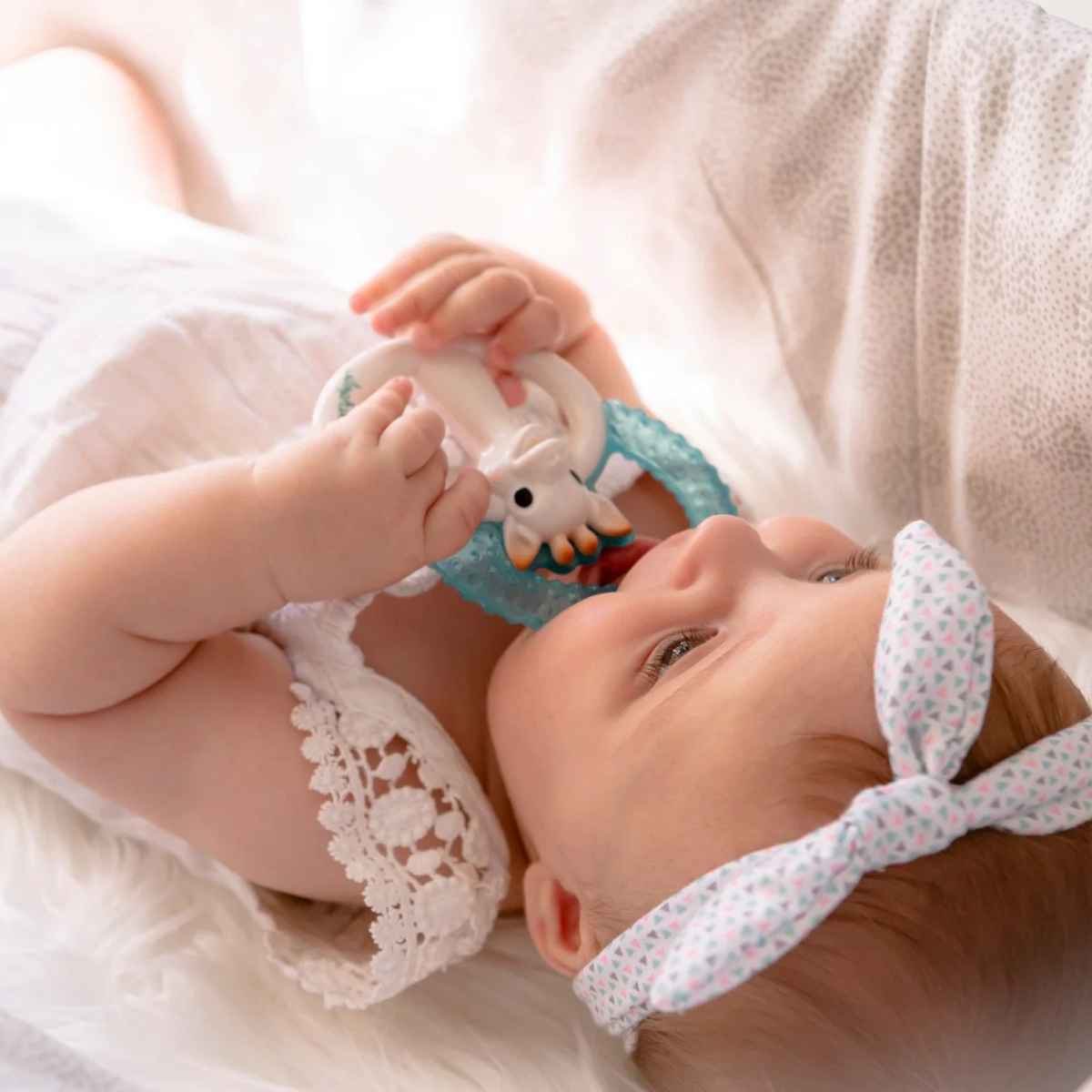 Sophie la Girafe cooling teether ring is designed to comfort and engage your baby’s sore gums. By chewing the chilled silicone rings, filled with a cooling gel, babies experience fast relief as the coolness helps numb discomfort from teething. Safe to refrigerate, these rings are easy for small hands to grasp and feature textured edges that gently massage and stimulate gums, promoting comfort and calm during teething.