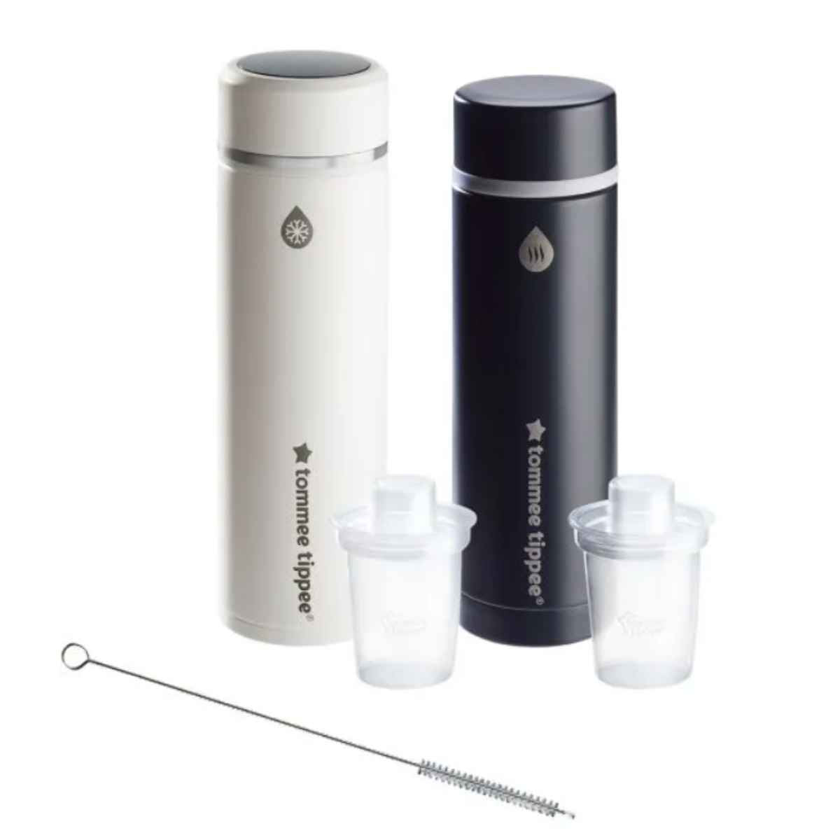 Contents: 2 x Flasks (1 x boiling water flask, 1 x feed cooler flask), 2x Milk powder dispensers, 1x cleaning brush